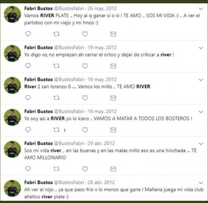 Fabricio bustos hincha de river. Fue a principios de junio cuando salió a la luz la. Pequeño detalle Bustos es hincha de River. Algunos hinchas no le perdonan unos tuits del 2012 a favor del Millo.